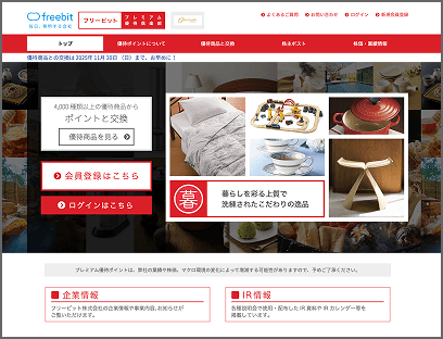- ・「フリービット・プレミアム優待倶楽部」への会員登録は必須ではございませんが、ご登録いただくとポイント残高の確認もでき、交換する優待商品の選択肢も増えます(4,000種類以上)ので、まだご登録がお済みでない場合は、公式サイトよりぜひご登録ください。