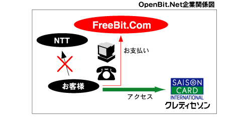 FBDCが特許出願中の特殊なインターネット接続と課金のスキームを利用する事で、<<セゾン>>会員は、インターネットを利用するにあたって必要となる電話料金を(NTTに支払うのではなく)<<セゾン>>カードで決済するだけで、インターネットを無料で使うことが出来るようになります。