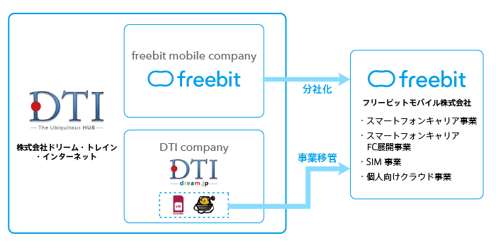 フリービット株式会社(本社:東京都渋谷区、代表取締役社長:石田宏樹、以下「フリービット」)は、フリービットグループが展開するスマートフォンキャリア事業freebit mobileを、当社連結子会社である株式会社ドリーム・トレイン・インターネット(以下、「DTI」)が2015年1月16日に設立した新会社「フリービットモバイル株式会社」(以下、「フリービットモバイル」)に承継し、分社化いたします。また、フリービット本体は、MVNE事業への事業リソースの集中を行い、現在行っている株式会社NTTドコモをMNO事業者とするMVNE事業だけに留まらず、広く他のMNO事業者との接続等も視野に入れた動きを拡大してまいります。なお本件につきましては、1月22日及び本日開催の取締役会にて決議いたしましたのでご報告いたします。