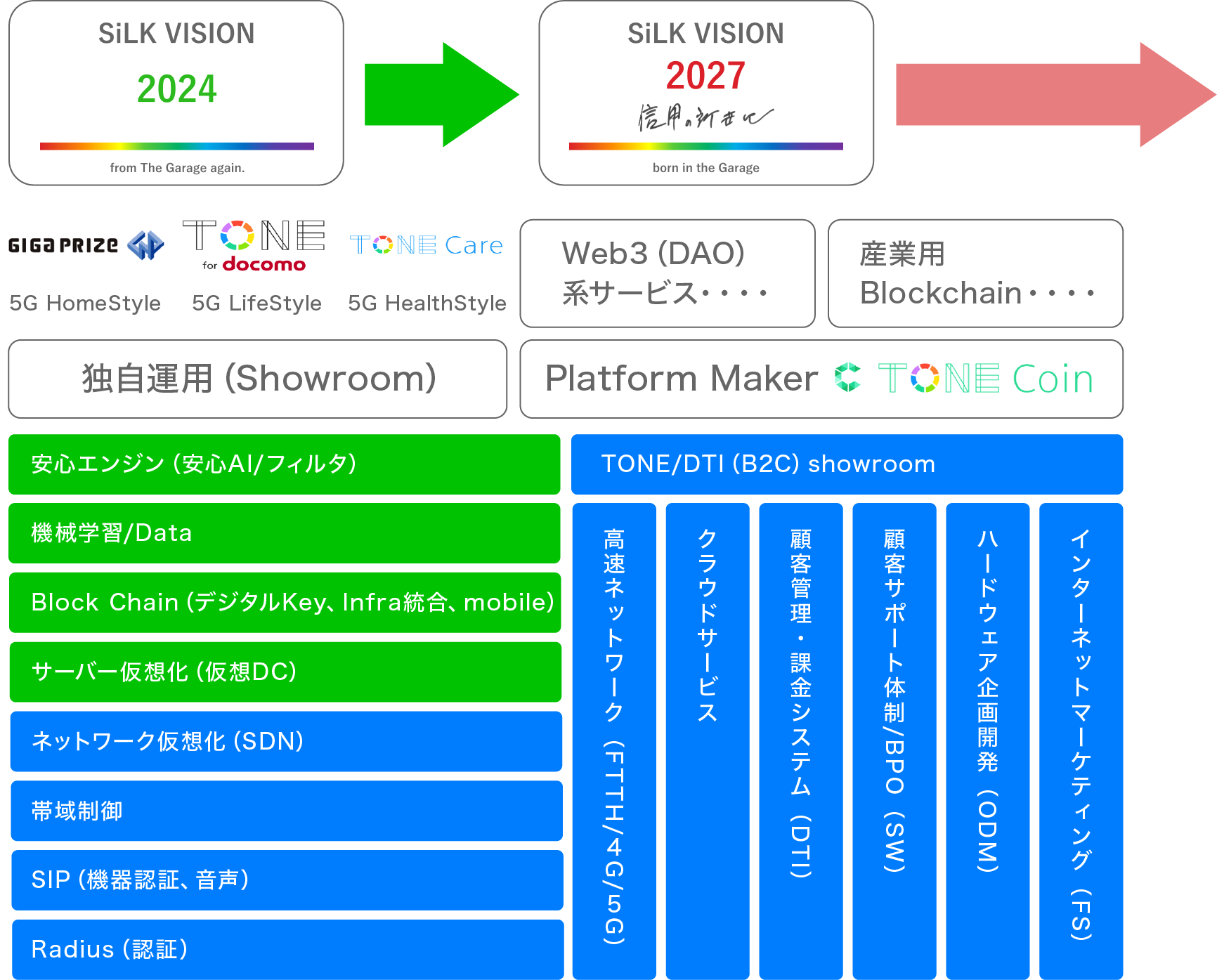 現在の「SiLK VISION 2024」を”Pre 5G”と位置付けて次期中期の成長事業を創出し、”Core 5G”と位置付ける「SiLK VISION 2027」でそれらの事業を大きく成長させ、”6G Standby”の時期となる「SiLK VISION 2030」で6G対応を進めるという10ヶ年計画を、フリービットは推進しています。